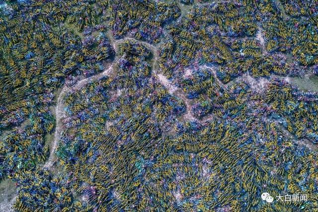 上海浦东超过10万辆共享单车整齐地排列在广阔的闲置土地上 图/吴国勇