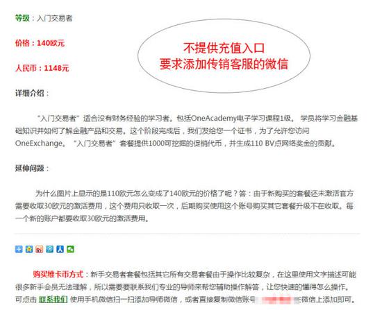 例如维卡币的官网,界面已挂出各等级套餐的价格及介绍,明明可以添加充值入口,客服却要求加微信沟通。文案解释道,“操作比较复杂,在这里使用文字描述可能很多新手会员无法理解,所以需要联系我们专业的导师来帮您辅助操作解答”。