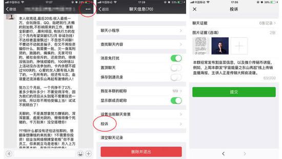 微信举报针对微信用户、微信群和朋友圈,举报操作大同小异。在此,互链脉搏以微信群为例,附上具体操作截图: