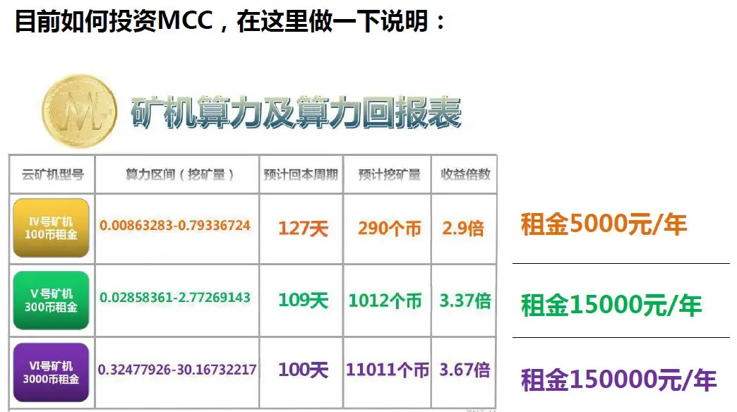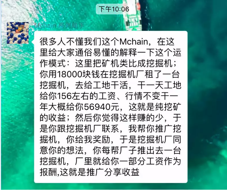 不过,区块链Truth(微信ID:chaintruth)发现,在M链的各个社群里,没有人讨论项目本身,大家似乎对M链基于以太坊ERC20发行的代币Mchain更感兴趣。以挖矿的名义,M链的推广者向新入局者许下了美好的承诺——投资6000元,一年赚回16800元;投资18000元,一年赚回58860元;投资180000元,一年赚回635100元。