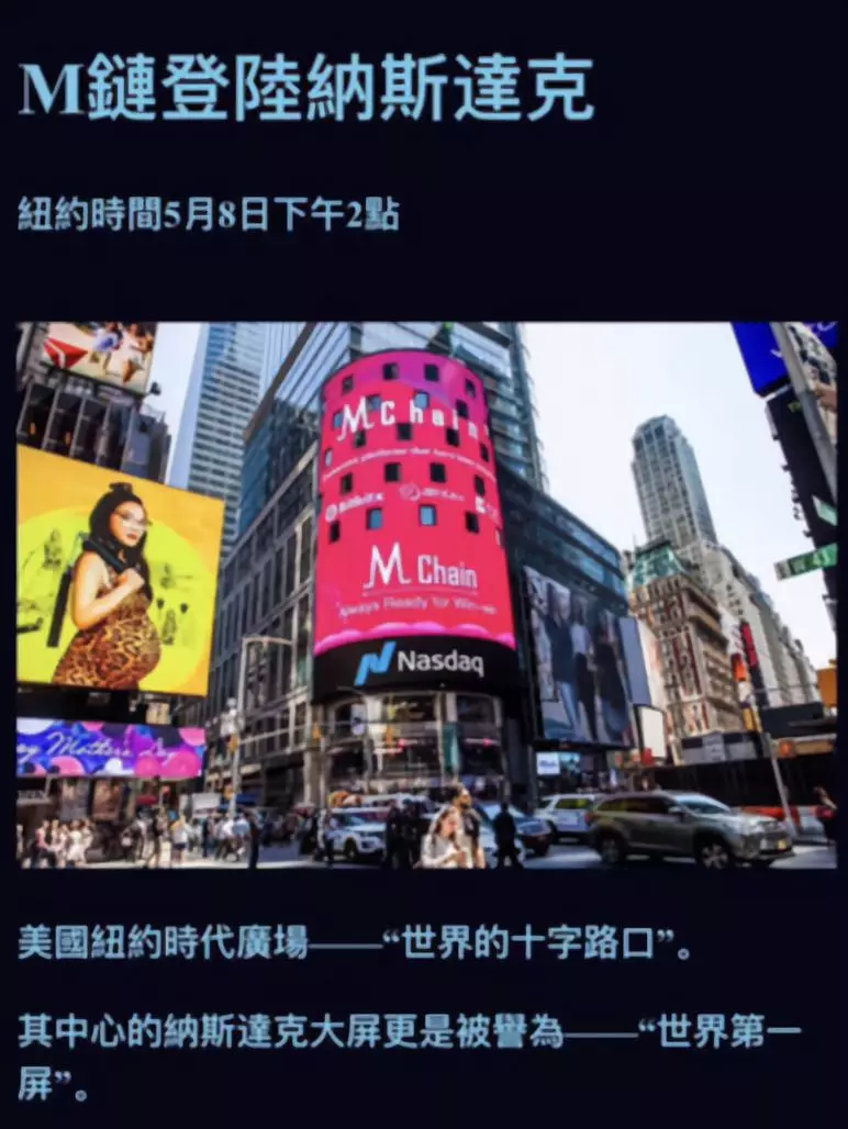M链宣称其登录了美国纳斯达克大屏播放广告,一位广告代理商告诉笔者,这只需要花费数千元。