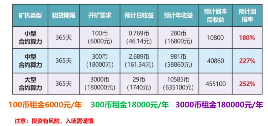笔者向小程表示“看不懂白皮书”后,小程发来一张“收益图”,并解释:可以花费1.8万元购买一年的“合约算力”进行挖矿,每台矿机每天产币2.68个,产出后可以在交易所出售或者直接卖给上家,预计一年的收入超过5.8万元,净利润超过4万元。