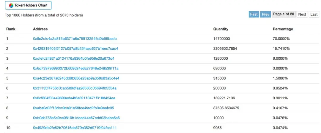 笔者从以太坊查询发现,大约98.5%的Mchain都集中在前8个地址里,控盘迹象明显。